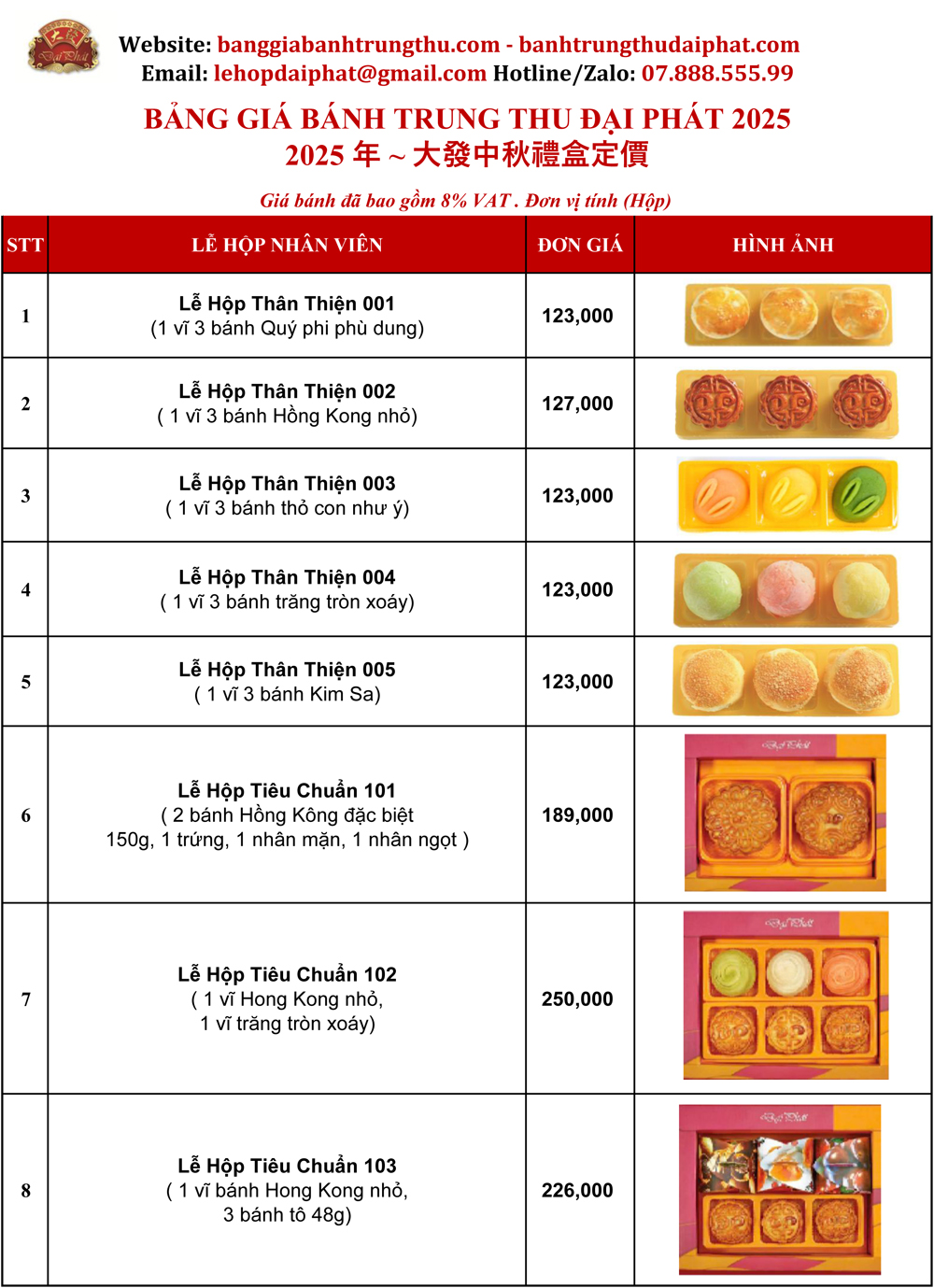 Sau đây là bảng giá bánh trung thu Đại Phát chính thức từ tổng công ty TNHH Thực Phẩm Thương Mại Đại Phát. Khi mua hóa đơn trên 4 triệu, bạn sẽ có thêm mức chiết khấu ưu đãi. Giảm trực tiếp trên giá bán. Liên hệ Zalo để được tư vấn báo giá.